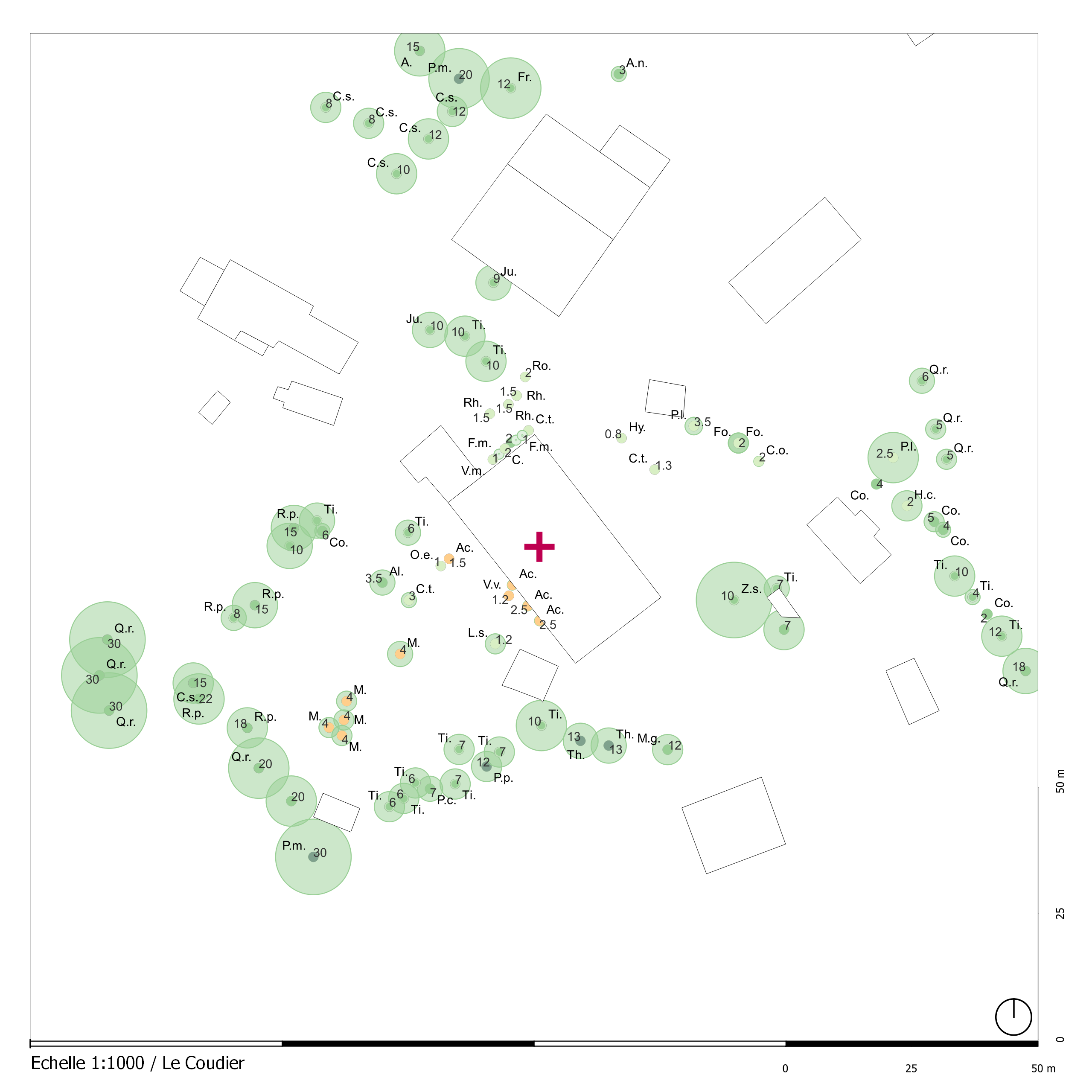 Ici, c’est les essences de … qui habitent le lieu. Le zelkova serrata, le kiwitier, les prunus. Faire un tableau de ce qu’on voit quand on arrive DU SENSIBLE