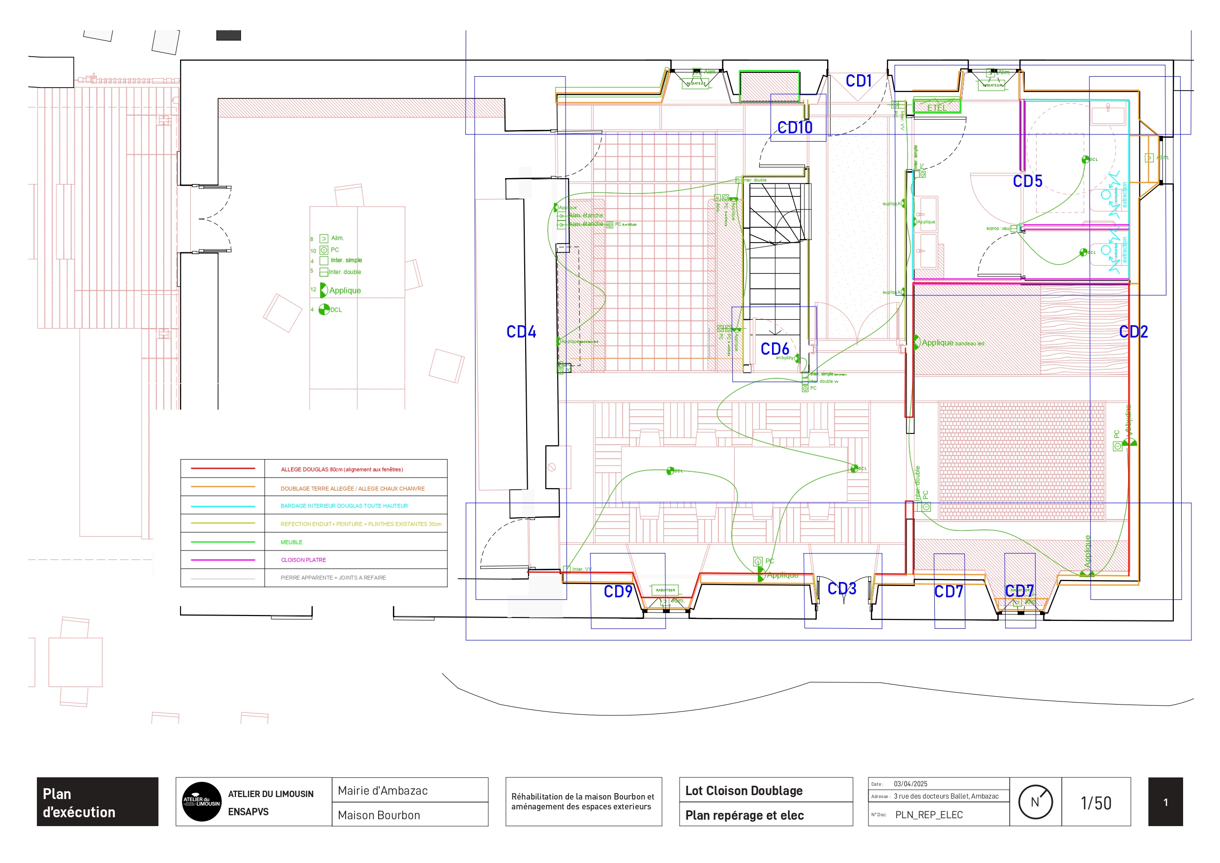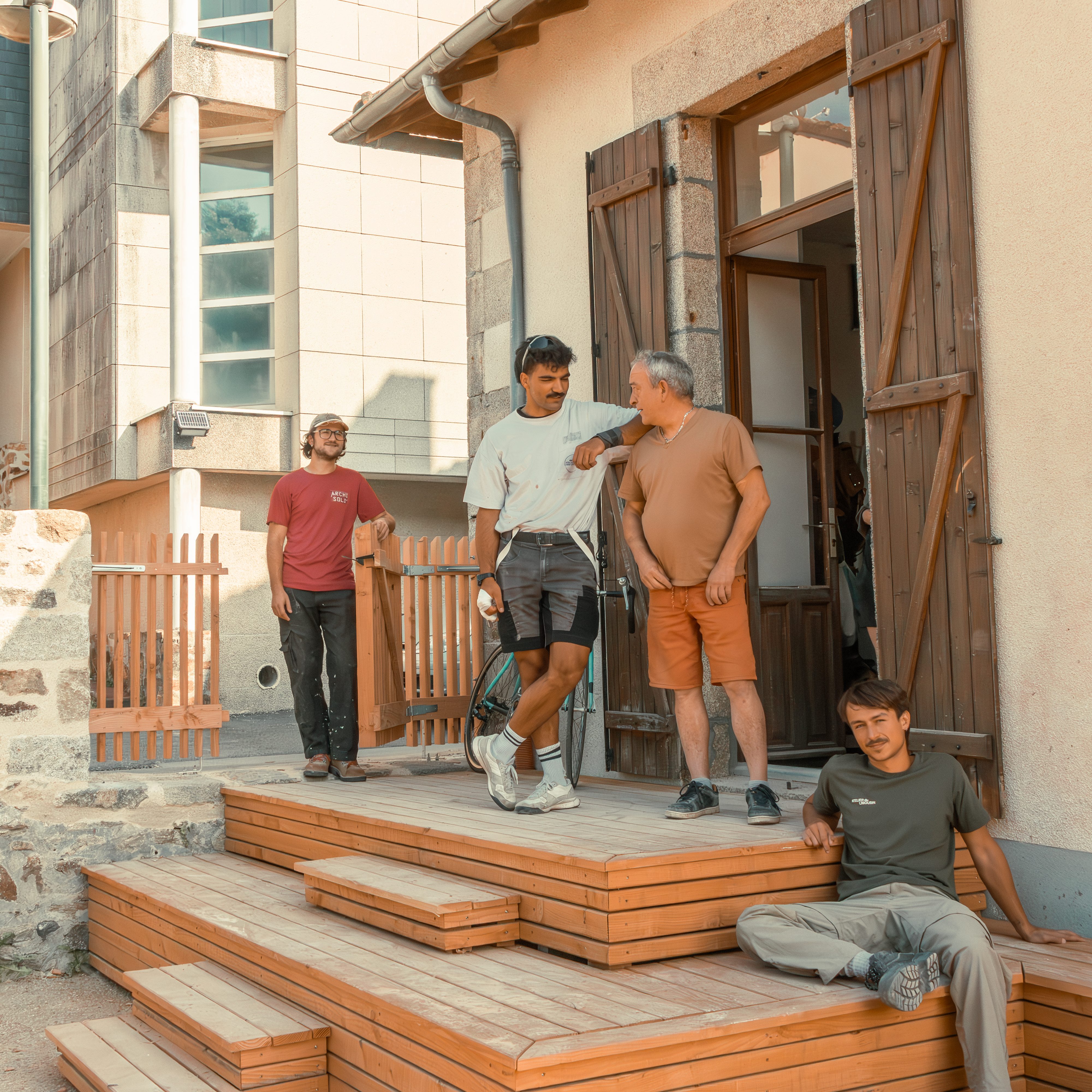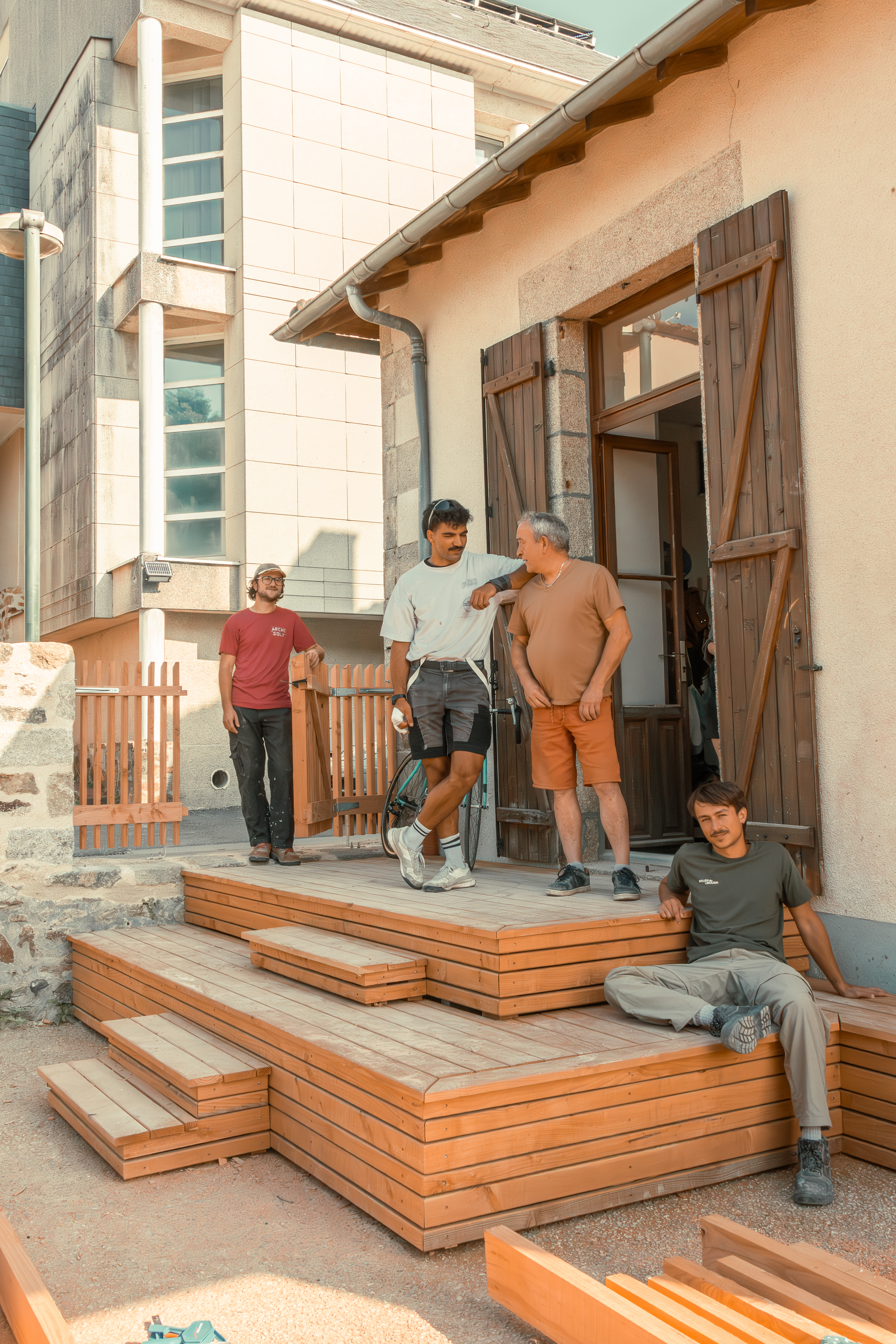 Choisie pour sa position centrale, la Maison Bourbon a été transformée en maison commune par un chantier-école associant étudiants, artisans, élus et habitants. L’usage de matériaux sobres et locaux – chanvre, terre, chaux, bois, pierre, gravats réemployés – témoigne d’une volonté de sobriété carbone et de circularité. Cette matérialité, issue en partie du réemploi et des ressources proches, permet d’inscrire le projet dans une logique de filières locales.