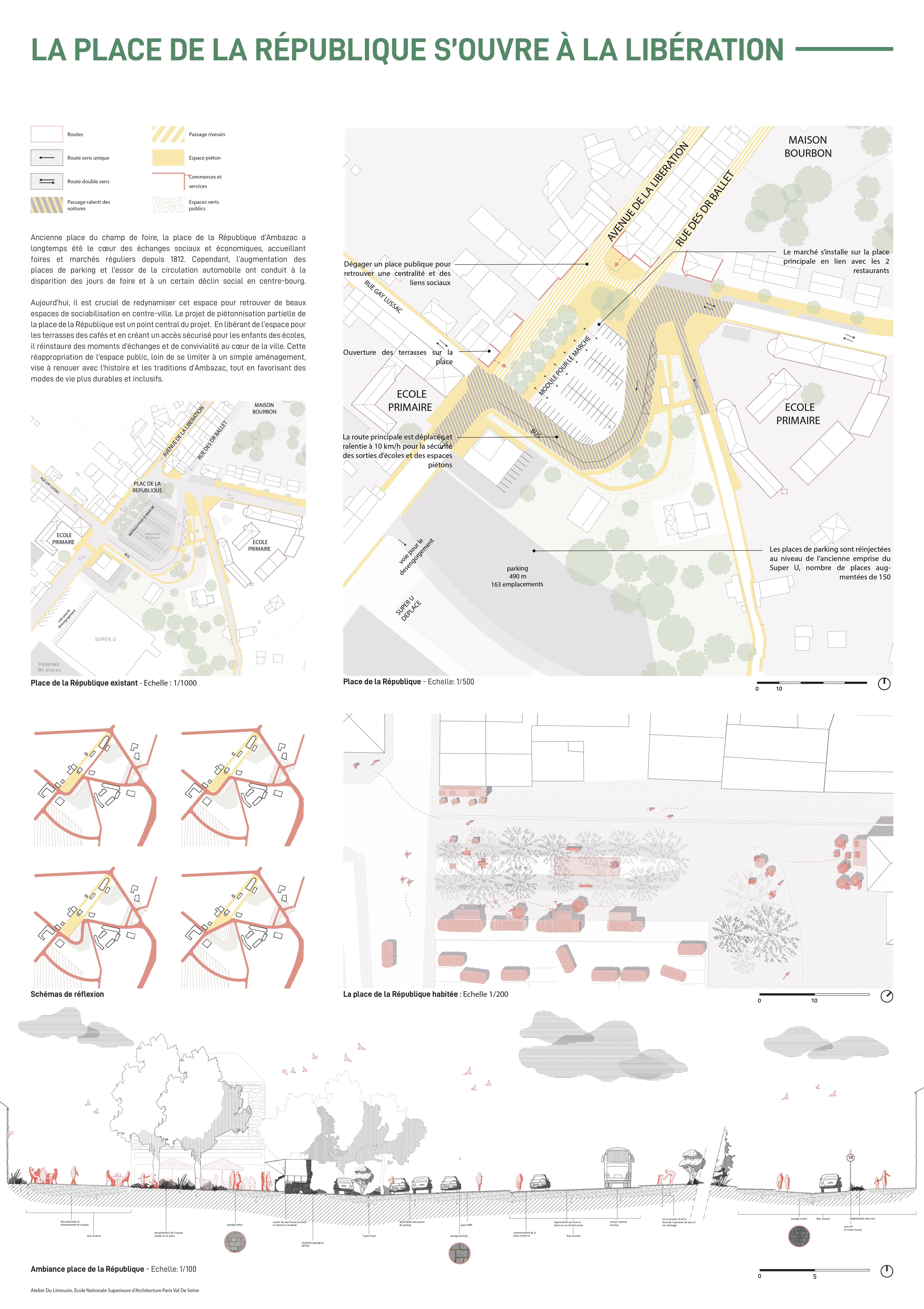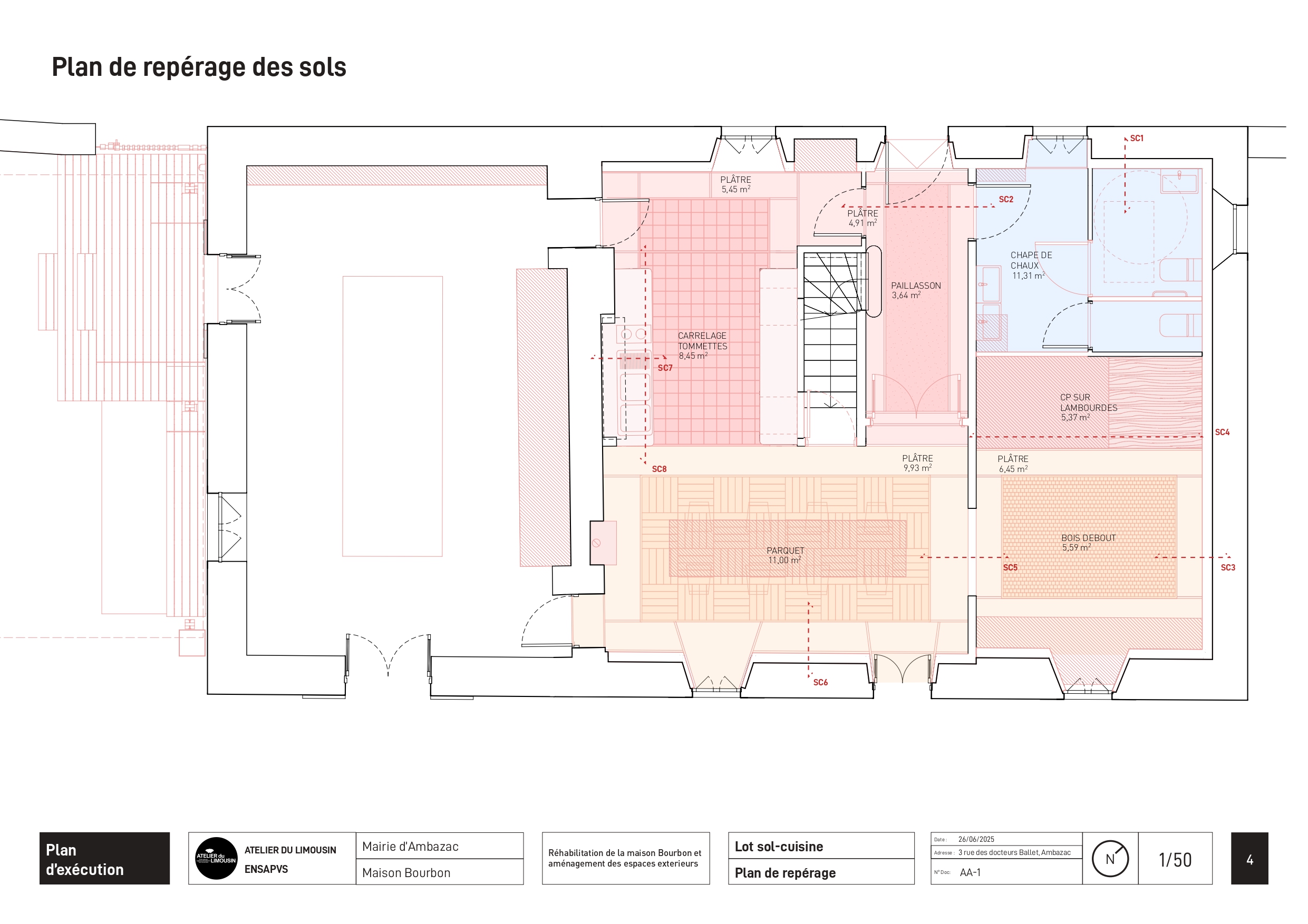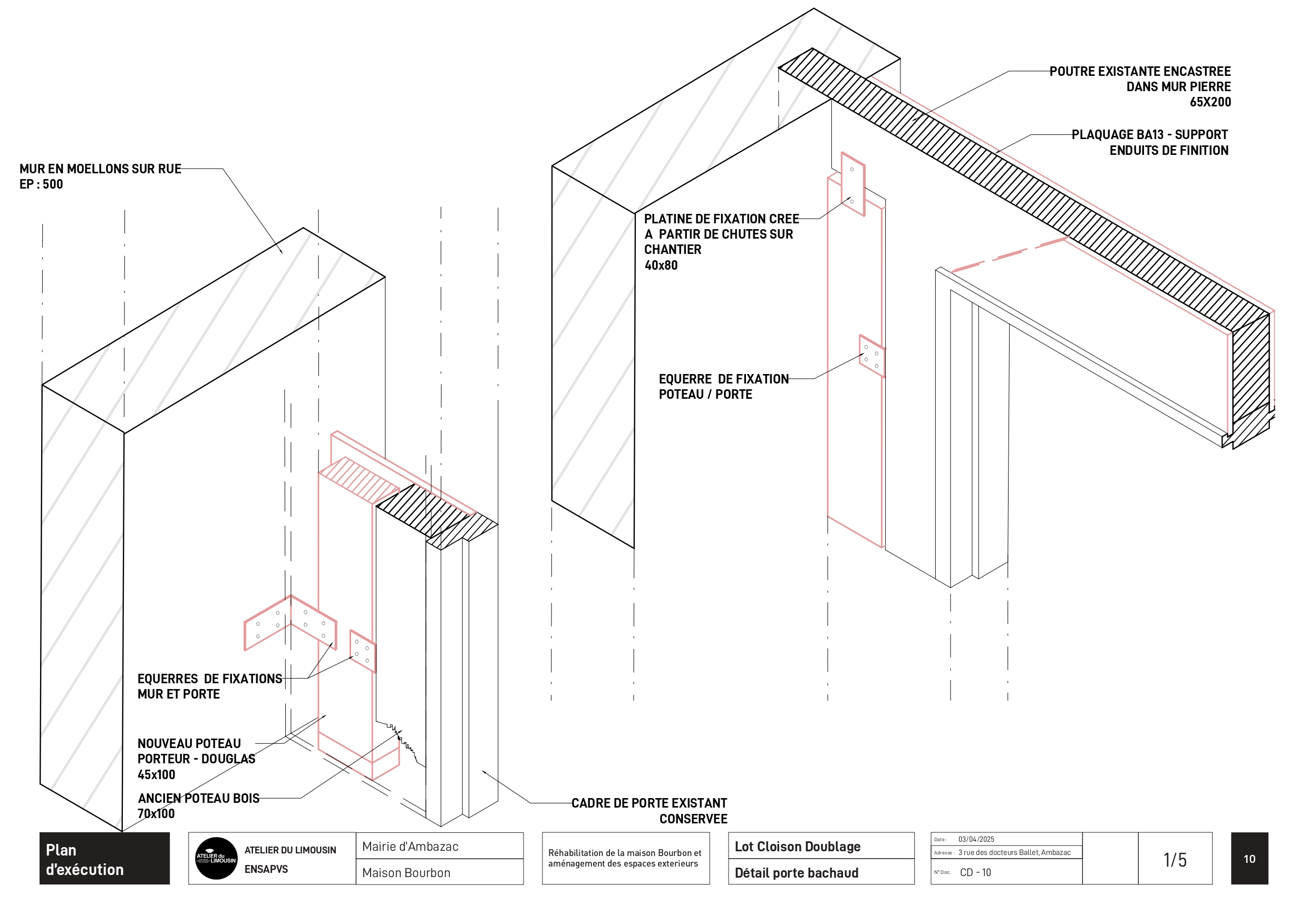 Choisie pour sa position centrale, la Maison Bourbon a été transformée en maison commune par un chantier-école associant étudiants, artisans, élus et habitants. L’usage de matériaux sobres et locaux – chanvre, terre, chaux, bois, pierre, gravats réemployés – témoigne d’une volonté de sobriété carbone et de circularité. Cette matérialité, issue en partie du réemploi et des ressources proches, permet d’inscrire le projet dans une logique de filières locales.